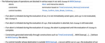 aborts Abort and interactive aborts constraints termination based on TimeConstrained, MemoryConstrained control transfers Throw, Confirm, Goto, Break, Continue, … - If an abort is initiated during the evaluation of init, it is not immediately acted upon, and expr is not evaluated, but cleanup is.