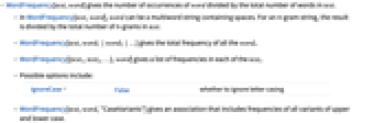 - In WordFrequency[text,word], word can be a multiword string containing spaces. For an n-gram string, the result is divided by the total number of n-grams in text.