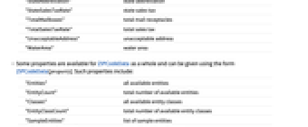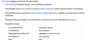"Entities" all available entities "EntityCount" total number of available entities "Classes" all available entity classes "EntityClassCount" total number of available entity classes "SampleEntities" list of sample entities "SampleEntityClasses" list of sample entity classes "EntityCanonicalNames" list of all entity canonical names "PropertyCanonicalNames" list of all property canonical names "EntityClassCanonicalNames" list of all entity class canonical names "RandomEntities" pseudorandom sample entities {"RandomEntities",n} n pseudorandom entities "RandomEntityClasses" pseudorandom sample entity classes {"RandomEntityClasses",n} n pseudorandom entity classes - The following annotations can be used in the third argument of ZIPCodeData[entity,property,annotation]: