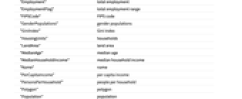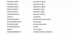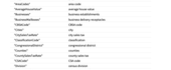 "AcceptableAddress" acceptable address "ActualAddress" actual address "AggregateHouseholdIncome" aggregate household income "AnnualPayroll" annual payroll "Area" area "AreaCodes" area code "AverageHouseValue" average house value "Businesses" business establishments "BusinessMailboxes" business delivery receptacles "CBSACode" CBSA code "Cities" city "CitySalesTaxRate" city sales tax "ClassificationCode" classification "CongressionalDistrict" congressional district "Counties" counties "CountySalesTaxRate" county sales tax "CSACode" CSA code "Division" census division "Employment" total employment "EmploymentFlag" total employment range "FIPSCode" FIPS code "GenderPopulations" gender populations "GiniIndex" Gini index "HousingUnits" households "LandArea" land area "MedianAge" median age "MedianHouseholdIncome" median household income "Name" name "PerCapitaIncome" per capita income "PersonsPerHousehold" people per household "Polygon" polygon "Population" population "Population15Plus" population ≥ age 15 "Population1Plus" population ≥ age 1 "Population25Plus" population ≥ age 25 "Population3Plus" population ≥ age 3 "Population5Plus" population ≥ age 5 "PopulationDensity" population density "Position" coordinates "PovertyPopulation" population by poverty status "PrimaryCityAliasCode" primary type "PrimaryCityType" primary postal station "PrimaryPlaceName" location "Region" census region "ResidentialMailboxes" residential delivery receptacles "StateAbbreviation" state abbreviation "StateSalesTaxRate" state sales tax "TotalMailboxes" total mail receptacles "TotalSalesTaxRate" total sales tax "UnacceptableAddress" unacceptable address "WaterArea" water area - Some properties are available for ZIPCodeData as a whole and can be given using the form ZIPCodeData[property]. Such properties include: