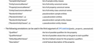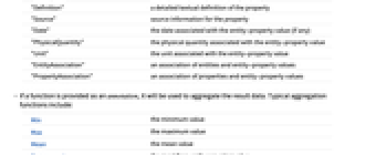 "Qualifiers" the list of possible qualifiers for the property "QualifierValues" the list of possible values that can be given to each qualifier "DefaultQualifierValues" the list of default values for the property's qualifiers "Description" a brief textual description of the property "Definition" a detailed textual definition of the property "Source" source information for the property "Date" the date associated with the entity-property value (if any) "PhysicalQuantity" the physical quantity associated with the entity-property value "Unit" the unit associated with the entity-property value "EntityAssociation" an association of entities and entity-property values "PropertyAssociation" an association of properties and entity-property values - If a function is provided as an annotation, it will be used to aggregate the result data. Typical aggregation functions include: