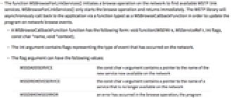 WSSDADDSERVICE the const char * argument contains a pointer to the name of the new service now available on the network WSSDREMOVESERVICE the const char * argument contains a pointer to the name of a service that is no longer available on the network WSSDBROWSEERROR an error has occurred in the browse operation; the program should use WSStopBrowsingForLinkServices() to terminate the browse operation; in addition, all cached service names should be removed; to receive further updates from the library regarding browse events, the program must call WSBrowseForLinkServices() again and initiate a new browse operation