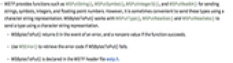 - WSTP provides functions such as WSPutString(), WSPutSymbol(), WSPutInteger32(), and WSPutReal64() for sending strings, symbols, integers, and floating-point numbers. However, it is sometimes convenient to send these types using a character string representation. WSBytesToPut() works with WSPutType(), WSPutRawSize() and WSPutRawData() to send a type using a character string representation.