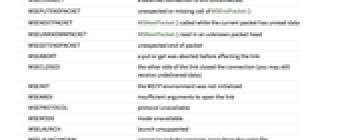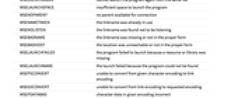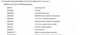 WSEOK everything is OK WSEDEAD link died WSEGBAD inconsistent data read WSEGSEQ WSGet() function called out of sequence WSEPBTK WSPutNext() passed a bad token WSEPSEQ WSPut() function called out of sequence WSEPBIG WSPutData() given too much data WSEOVFL machine number overflow WSEMEM out of memory WSEACCEPT failure to accept socket connection WSECONNECT a deferred connection is still unconnected WSEPUTENDPACKET unexpected or missing call of WSEndPacket() WSENEXTPACKET WSNextPacket() called while the current packet has unread data WSEUNKNOWNPACKET WSNextPacket() read in an unknown packet head WSEGETENDPACKET unexpected end of packet WSEABORT a put or get was aborted before affecting the link WSECLOSED the other side of the link closed the connection (you may still receive undelivered data) WSEINIT the WSTP environment was not initialized WSEARGV insufficient arguments to open the link WSEPROTOCOL protocol unavailable WSEMODE mode unavailable WSELAUNCH launch unsupported WSELAUNCHAGAIN cannot launch the program again from the same file WSELAUNCHSPACE insufficient space to launch the program WSENOPARENT no parent available for connection WSENAMETAKEN the linkname was already in use WSENOLISTEN the linkname was found not to be listening WSEBADNAME the linkname was missing or not in the proper form WSEBADHOST the location was unreachable or not in the proper form WSELAUNCHFAILED the program failed to launch because a resource or library was missing WSELAUNCHNAME the launch failed because the program could not be found WSEPSCONVERT unable to convert from given character encoding to link encoding WSEGSCONVERT unable to convert from link encoding to requested encoding WSEPDATABAD character data in given encoding incorrect WSENOTEXE specified file is not a WSTP executable WSESYNCOBJECTMAKE unable to create WSTP synchronization object WSEBACKOUT yield function terminated WSTP operation WSEBADOPTSYM unable to recognize symbol value on link WSEBADOPTSTR unable to recognize string value on link WSENEEDBIGGERBUFFER function call needs bigger buffer argument - WSError() is declared in the WSTP header file wstp.h.