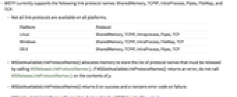 Platform Protocol Linux SharedMemory, TCPIP, Intraprocess, Pipes, TCP Windows SharedMemory, TCPIP, IntraProcess, FileMap, TCP OS X SharedMemory, TCPIP, IntraProcess, Pipes, TCP - WSGetAvailableLinkProtocolNames() allocates memory to store the list of protocol names that must be released by calling WSReleaseLinkProtocolNames(). If WSGetAvailableLinkProtocolNames() returns an error, do not call WSReleaseLinkProtocolNames() on the contents of p.