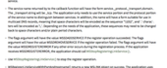- The service name returned by to the callback function will have the form service._protocol._transport.domain. The _transport string will be _tcp. The application only needs to use the service portion and the protocol portion of the service name to distinguish between services. In addition, the name will have a form suitable for use in multicast DNS records, meaning that space characters will be encoded as the sequence "\\032", and '.' characters will be encoded as '\.'. Depending on the needs of the application, these sequences may need to be changed back to space characters and/or plain period characters.