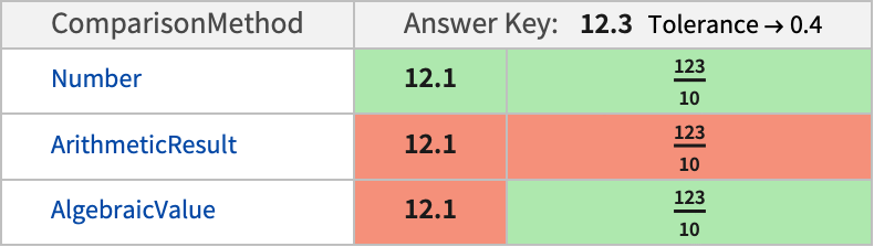 - The following table shows a comparison of "Number" with other comparison methods for a typical answer key and two possible submitted answers:
