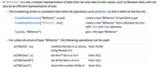 CreateDataStructure[ "BitVector",length] create a new "BitVector" of specified length CreateDataStructure["BitVector",blist] create a new "BitVector" from a Boolean list blist with True and False elements Typed[x,"BitVector"] give x the type "BitVector" - For a data structure of type "BitVector", the following operations can be used: