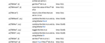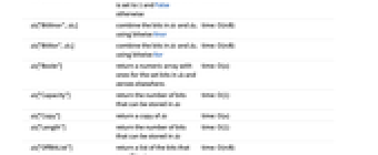 ds["BitAnd",dsi] combine the bits in ds and dsi using bitwise And time: O(n/8) ds["BitClear",k] set the kth bit in ds to 0 time: O(1) ds["BitClearAll"] set all the bits in ds to 0 time: O(n) ds["BitCount"] return the number of bits in ds that are set to 1 time: O(n) ds["BitGet",k] get the kth bit in ds time: O(1) ds["BitInvert",k] invert the value of the kth bit of ds time: O(1) ds["BitList"] return a list of bits that are set to 1 in ds time: O(n) ds["BitNand",dsi] combine the bits in ds and dsi using bitwise Nand time: O(n/8) ds["BitNor",dsi] combine the bits in ds and dsi using bitwise Nor time: O(n/8) ds["BitNot",dsi] toggle the bits in ds time: O(n/8) ds["BitOr",dsi] combine the bits in ds and dsi using bitwise Or time: O(n/8) ds["BitSet",k] set the kth bit in ds to 1 time: O(1) ds["BitTest",k] return True if the kth bit of ds is set to 1 and False otherwise time: O(1) ds["BitXnor",dsi] combine the bits in ds and dsi using bitwise Xnor time: O(n/8) ds["BitXor",dsi] combine the bits in ds and dsi using bitwise Xor time: O(n/8) ds["Boole"] return a numeric array with ones for the set bits in ds and zeroes elsewhere. time: O(n) ds["Capacity"] return the number of bits that can be stored in ds time: O(1) ds["Copy"] return a copy of ds time: O(n) ds["Length"] return the number of bits that can be stored in ds time: O(1) ds["OffBitList"] return a list of the bits that are off in ds time: O(n/8) ds["OffBitList",dsi] return a list of the bits that are off in both ds and dsi time: O(n/8) ds["OnBitList",dsi] return a list of the bits that are on in both ds and dsi time: O(n/8) ds["Visualization"] return a visualization of ds time: O(n) - The following functions are also supported:
