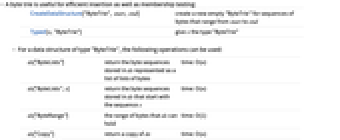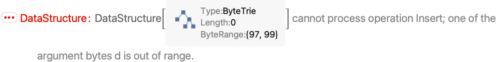CreateDataStructure["ByteTrie", start, end] create a new empty "ByteTrie" for sequences of bytes that range from start to end Typed[x,"ByteTrie"] give x the type "ByteTrie" - For a data structure of type "ByteTrie", the following operations can be used: