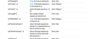 ds["ByteLists"] return the byte sequences stored in ds represented as a list of lists of bytes time: O(n) ds["ByteLists",s] return the byte sequences stored in ds that start with the sequence s time: O(n) ds["ByteRange"] the range of bytes that ds can hold time: O(1) ds["Copy"] return a copy of ds time: O(n) ds["EmptyQ"] True, if ds has no elements time: O(1) ds["FreeQ",s] True , if the byte sequence s is not stored in ds time: O(log n) ds["Insert",s] insert the byte sequence s in ds time: O(log n) ds["Length"] the number of byte sequences stored in ds time: O(1) ds["MemberQ",s] True, if the byte sequence s is stored in ds time: O(log n) ds["NumericArrays"] return the byte sequences stored in ds represented as a list of numeric arrays time: O(n) ds["NumericArrays",s] return the byte sequences stored in ds that start with the sequence s time: O(n) ds["Strings"] return the byte sequences stored in ds represented as a list of strings time: O(n) ds["Strings",s] return the byte sequences stored in ds that start with the sequence s time: O(n) - The following functions are also supported: