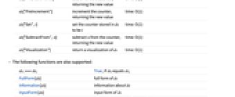 ds["AddTo",n] add n to the counter, returning the new value time: O(1) ds["Copy"] return a copy of ds time: O(1) ds["Decrement"] decrement the counter, returning the old value time: O(1) ds["Get"] get the value of the counter stored in ds time: O(1) ds["Increment"] increment the counter, returning the old value time: O(1) ds["PreDecrement"] decrement the counter, returning the new value time: O(1) ds["PreIncrement"] increment the counter, returning the new value time: O(1) ds["Set",i] set the counter stored in ds to be i time: O(1) ds["SubtractFrom",n] subtract n from the counter, returning the new value time: O(1) ds["Visualization"] return a visualization of ds time: O(1) - The following functions are also supported: