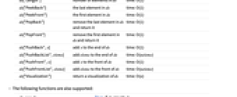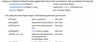 CreateDataStructure["Deque"] create a new empty "Deque" CreateDataStructure["Deque",elems] create a new "Deque" containing elems Typed[x,"Deque"] give x the type "Deque" - For a data structure of type "Deque", the following operations can be used: