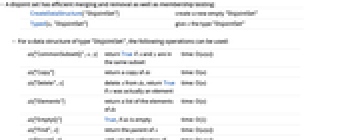 CreateDataStructure[ "DisjointSet"] create a new empty "DisjointSet" Typed[x,"DisjointSet"] give x the type "DisjointSet" - For a data structure of type "DisjointSet", the following operations can be used: