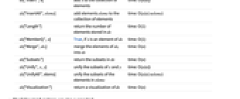 ds["CommonSubsetQ",x,y] return True if x and y are in the same subset time: O(α(n)) ds["Copy"] return a copy of ds time: O(n) ds["Delete",x] delete x from ds, return True if x was actually an element time: O(n) ds["Elements"] return a list of the elements of ds time: O(n) ds["EmptyQ"] True, if ds is empty time: O(1) ds["Find",x] return the parent of x time: O(α(n)) ds["Insert",x] add x to the collection of elements time: O(α(n)) ds["InsertAll",elems] add elements elems to the collection of elements time: O(α(n) nelems) ds["Length"] return the number of elements stored in ds time: O(1) ds["MemberQ",x] True, if x is an element of ds time: O(1) ds["Merge",dsi] merge the elements of dsi into ds time: O(n) ds["Subsets"] return the subsets in ds time: O(n) ds["Unify",x,y] unify the subsets of x and y time: O(α(n)) ds["UnifyAll",elems] unify the subsets of the elements in elems time: O(α(n) nelems) ds["Visualization"] return a visualization of ds time: O(n) - The following functions are also supported: