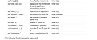 part of dstime: O(n) ds["DropAll"] drop all the elements from ds time: O(n) ds["DropLast"] drop the last element of ds time: O(1) ds["Elements"] return a list of the elements of ds time: O(n) ds["EmptyQ"] True, if ds has no elements time: O(1) ds["Fold",fun,init] apply fun to the elements of ds, starting with init, accumulating a result time: O(n) ds["Insert",x,i ] insert x into ds at position i time: O(1) ds["JoinBack",elems ] join elems to the back of ds time: O(nelems) ds["Length"] the number of elements stored in ds time: O(1) ds["Part",i] give the i