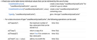 CreateDataStructure["LeastRecentlyUsedCache",capacity] create a new empty "LeastRecentlyUsedCache" for a total of capacity values CreateDataStructure["LeastRecentlyUsedCache",elems] create a new "LeastRecentlyUsedCache" containing elems CreateDataStructure["LeastRecentlyUsedCache",cache, f] create a new "LeastRecentluUsedCache" with specified evict function f Typed[x,"LeastRecentlyUsedCache"] give x the type "LeastRecentlyUsedCache" - For a data structure of type "LeastRecentlyUsedCache", the following operations can be used: