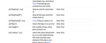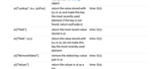 ds["Capacity"] the maximum number of key-value pairs that can be stored in ds time: O(1) ds["Copy"] return a copy of ds time: O(n) ds["EmptyQ"] return True if ds contains no key-value pairs time: O(1) ds["Insert",keyvalue] add key to ds with the associated value and return True if something was evicted from the cache time: O(1) ds["KeyDrop",key] drop key and its value from ds time: O(1) ds["KeyDropAll"] drop all the keys and their values from ds time: O(n) ds["KeyExistsQ",key] True, if the key exists in ds time: O(1) ds["Keys"] return the keys in ds as a list time: O(n) ds["Length"] the number of key-value pairs stored in ds time: O(1) ds["Lookup",key] return the value stored with key in ds and make this key the most recently used element; if the key is not found, return a Missing object time: O(1) ds["Lookup",key,defFun] return the value stored with key in ds and make this key the most recently used element; if the key is not found, return defFun[key] time: O(1) ds["Peek"] return the most recent value stored in ds time: O(1) ds["Peek",key] return the value stored with key in ds; do not make this key the most recently used element time: O(1) ds["RemoveOldest"] remove the oldest key-value pair in ds time: O(1) ds["Values"] return the values in ds as a list time: O(n) ds["Visualization"] return a visualization of ds time: O(n) - The following functions are also supported: