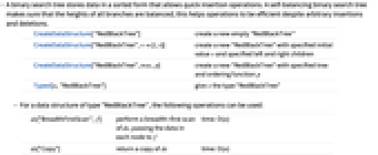 CreateDataStructure[ "RedBlackTree"] create a new empty "RedBlackTree" CreateDataStructure["RedBlackTree",v{l,r}] create a new "RedBlackTree" with specified initial value v and specified left and right children CreateDataStructure["RedBlackTree",tree,p] create a new "RedBlackTree" with specified tree and ordering function p Typed[x,"RedBlackTree"] give x the type "RedBlackTree" - For a data structure of type "RedBlackTree", the following operations can be used:
