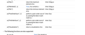 ds["BreadthFirstScan",f] perform a breadth-first scan of ds, passing the data in each node to f time: O(n) ds["Copy"] return a copy of ds time: O(n) ds["Delete",x] delete x from ds time: O(log n) ds["DeleteAll"] delete all elements from ds time: O(n) ds["DropMax"] remove the maximum element of ds and return it time: O(log n) ds["DropMin"] remove the minimum element of ds and return it time: O(log n) ds["Elements"] return a list of the elements of ds time: O(n) ds["EmptyQ"] True, if ds has no nodes time: O(1) ds["FreeQ",x] True, if ds does not contain x time: O(log n) ds["InOrderScan",f] perform an in-order scan of ds, passing the data in each node to f time: O(n) ds["Insert",x] insert x into ds time: O(log n) ds["Length"] the number of nodes in ds time: O(1) ds["Max"] return the maximum element of ds time: O(log n) ds["MemberQ",x] True, if ds contains x time: O(log n) ds["Min"] return the minimum element of ds time: O(log n) ds["PostOrderScan",f] perform a post-order scan of ds, passing the data in each node to f time: O(n) ds["PreOrderScan",f] perform a pre-order scan of ds, passing the data in each node to f time: O(n) ds["Visualization"] return a visualization of ds time: O(n) - The following functions are also supported: