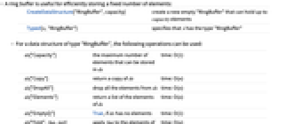 CreateDataStructure["RingBuffer",capacity] create a new empty "RingBuffer" that can hold up to capacity elements Typed[x,"RingBuffer"] specifies that x has the type "RingBuffer" - For a data structure of type "RingBuffer", the following operations can be used: