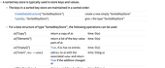 CreateDataStructure[ "SortedKeyStore"] create a new empty "SortedKeyStore" Typed[x,"SortedKeyStore"] give x the type "SortedKeyStore" - For a data structure of type "SortedKeyStore", the following operations can be used: