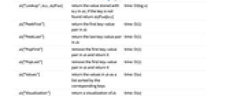 ds["Copy"] return a copy of ds time: O(n) ds["Elements"] return a list of the key-value pairs of ds time: O(n) ds["EmptyQ"] True, if ds has no entries time: O(1) ds["Insert",keyvalue] add key to ds with the associated value and return True if the addition changed ds time: O(log n) ds["KeyDrop",key] drop key and its value from ds time: O(log n) ds["KeyDropAll"] drop all the keys and their values from ds time: O(n) ds["KeyExistsQ",key] True, if the key exists in ds time: O(log n) ds["Keys"] return the keys in ds as a sorted list time: O(n) ds["KeyValueFold",fun,init] apply fun to the rules of ds, starting with init, accumulating a result time: O(n) ds["KeyValueScan",fun] apply fun to the rules of ds time: O(n) ds["Length"] the number of key-value pairs stored in ds time: O(1) ds["Lookup",key] return the value stored with key in ds; if the key is not found return a Missing object time: O(log n) ds["Lookup",key,defFun] return the value stored with key in ds; if the key is not found return defFun[key] time: O(log n) ds["PeekFirst"] return the first key-value pair in ds time: O(1) ds["PeekLast"] return the last key-value pair in ds time: O(1) ds["PopFirst"] remove the first key-value pair in ds and return it time: O(1) ds["PopLast"] remove the first key-value pair in ds and return it time: O(1) ds["Values"] return the values in ds as a list sorted by the corresponding keys time: O(n) ds["Visualization"] return a visualization of ds time: O(n) - The following functions are also supported: