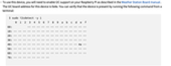 To use this device, you will need to enable I2C support on your Raspberry Pi as described in the Weather Station Board manual. The I2C board address for this device is 0x4e. You can verify that the device is present by running the following command from a terminal: