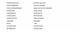 AuxiliaryCharacters auxiliary characters CommonAlphabet common alphabet CommonAlphabetUpper uppercase common alphabet EntityClasses entity classes EntityTypeList entity type list FullCharacters full characters IndexCharacters index characters Languages languages Name name UnicodeLocale Unicode locale WritingScripts writing scripts
