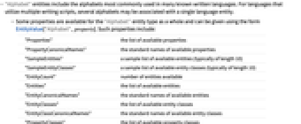 "Properties" the list of available properties "PropertyCanonicalNames" the standard names of available properties "SampleEntities" a sample list of available entities (typically of length 10) "SampleEntityClasses" a sample list of available entity classes (typically of length 10) "EntityCount" number of entities available "Entities" the list of available entities "EntityCanonicalNames" the standard names of available entities "EntityClasses" the list of available entity classes "EntityClassCanonicalNames" the standard names of available entity classes "PropertyClasses" the list of available property classes "PropertyClassCanonicalNames" the standard names of available property classes "PropertyCount" number of properties available - The following annotations can be used in the third argument of EntityValue["Alphabet",property,annotation]: