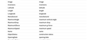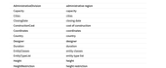 AdministrativeDivision administrative region Capacity capacity Cities cities ClosingDate closing date ConstructionCost cost of construction Coordinates coordinates Country country Designer designer Duration duration EntityClasses entity classes EntityTypeList entity type list Height height HeightRestriction height restriction Image image Inversions inversions Latitude latitude Length length Longitude longitude Manufacturer manufacturer MaximumAngle maximum vertical angle MaximumDrop maximum drop MaximumGforce maximum g-force MaximumSpeed maximum speed Name name ObjectStatus construction status OpeningDate opening date OperatingStatus operating status Park amusement park Position position