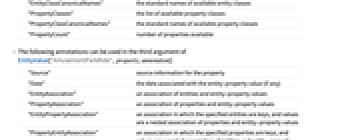 "Source" source information for the property "Date" the date associated with the entity-property value (if any) "EntityAssociation" an association of entities and entity-property values "PropertyAssociation" an association of properties and entity-property values "EntityPropertyAssociation" an association in which the specified entities are keys, and values are a nested association of properties and entity-property values "PropertyEntityAssociation" an association in which the specified properties are keys, and values are a nested association of entities and entity-property values "Dataset" a dataset in which the specified entities are keys, and values are an association of property names and entity-property values - The following annotations can be used in the second argument of EntityValue[property,annotation]:
