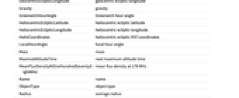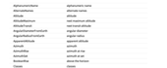 AlphanumericName alphanumeric name AlternateNames alternate names Altitude altitude AltitudeMaximum next maximum altitude AltitudeTransit next transit altitude AngularDiameterFromEarth angular diameter AngularRadiusFromEarth angular radius ApparentAltitude apparent altitude Azimuth azimuth AzimuthRise azimuth at rise AzimuthSet azimuth at set BooleanRise above the horizon Classes classes Constellation constellation DailyTimeAboveHorizon daily time above horizon Declination declination Diameter average diameter DistanceFromEarth distance from Earth DistanceFromSun distance from Sun EntityClasses entity classes EntityTypeList entity type list EscapeVelocity escape velocity FanaroffRileyClass Fanaroff-Riley class GalacticLatitude galactic latitude GalacticLongitude galactic longitude GeocentricEclipticLatitude geocentric ecliptic latitude GeocentricEclipticLongitude geocentric ecliptic longitude Gravity gravity GreenwichHourAngle Greenwich hour angle HeliocentricEclipticLatitude heliocentric ecliptic latitude HeliocentricEclipticLongitude heliocentric ecliptic longitude HelioCoordinates heliocentric ecliptic XYZ coordinates LocalHourAngle local hour angle Mass mass MaximalAltitudeTime next maximum altitude time MeanFluxDensityAtOneHundredSeventyEightMHz mean flux density at 178 MHz Name name ObjectType object type Radius average radius Redshift redshift RelatedObjects related objects RightAscension right ascension RiseTime next rise SetTime next set SiderealHourAngle sidereal hour angle SpectralIndex spectral index SunElongation elongation from the Sun TransitTime next transit time ZenithAngle zenith angle