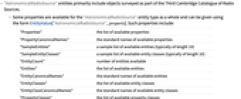 "Properties" the list of available properties "PropertyCanonicalNames" the standard names of available properties "SampleEntities" a sample list of available entities (typically of length 10) "SampleEntityClasses" a sample list of available entity classes (typically of length 10) "EntityCount" number of entities available "Entities" the list of available entities "EntityCanonicalNames" the standard names of available entities "EntityClasses" the list of available entity classes "EntityClassCanonicalNames" the standard names of available entity classes "PropertyClasses" the list of available property classes "PropertyClassCanonicalNames" the standard names of available property classes "PropertyCount" number of properties available - The following annotations can be used in the third argument of EntityValue["AstronomicalRadioSource",property,annotation]:
