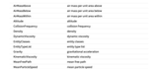 AirMassAbove air mass per unit area above AirMassBelow air mass per unit area below AirMassWithin air mass per unit area within Altitude altitude CollisionFrequency collision frequency Density density DynamicViscosity dynamic viscosity EntityClasses entity classes EntityTypeList entity type list Gravity gravitational acceleration KinematicViscosity kinematic viscosity MeanFreePath mean free path MeanParticleSpeed mean particle speed Name name OverlappingLayers overlapping layers Pressure barometric pressure Sound speed of sound Temperature kinetic temperature