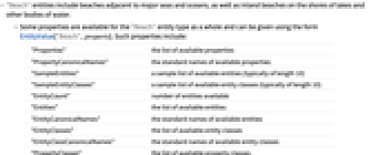 - Some properties are available for the "Beach" entity type as a whole and can be given using the form EntityValue["Beach",property]. Such properties include: