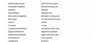 AdditionalBondTypes additional bond types AllowedBondingRules allowed bonding rules Alphabet alphabet AlphabetRules alphabet rules AlternateEncodingRules alternate encoding rules BondTypes all associated bond types Caption caption CircularQ circular ComplementLetterRules complement letter rules DegenerateAlphabet degenerate alphabet DegenerateLetterRules degenerate letter rules EntityTypeList entity type list FullAlphabet all letters Name name PrimaryStructureBondType primary structure bond type