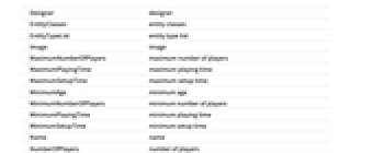 Designer designer EntityClasses entity classes EntityTypeList entity type list Image image MaximumNumberOfPlayers maximum number of players MaximumPlayingTime maximum playing time MaximumSetupTime maximum setup time MinimumAge minimum age MinimumNumberOfPlayers minimum number of players MinimumPlayingTime minimum playing time MinimumSetupTime minimum setup time Name name NumberOfPlayers number of players PlayingTime playing time Publisher publisher ReleaseDate release date SetupTime setup time