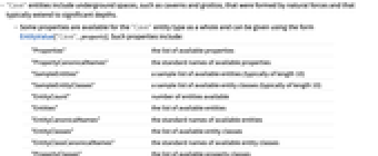 - Some properties are available for the "Cave" entity type as a whole and can be given using the form EntityValue["Cave",property]. Such properties include: