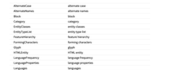 AlternateCase alternate case AlternateNames alternate names Block block Category category EntityClasses entity classes EntityTypeList entity type list FeatureHierarchy feature hierarchy FormingCharacters forming characters Glyph glyph HTMLEntity HTML entity LanguageFrequency language frequency LanguageProperties language properties Languages languages Mirror mirror Name name SimilarCharacters similar characters