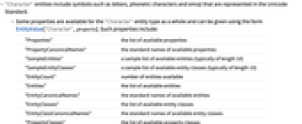 - Some properties are available for the "Character" entity type as a whole and can be given using the form EntityValue["Character",property]. Such properties include: