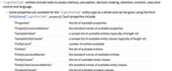 - Some properties are available for the "CognitiveTask" entity type as a whole and can be given using the form EntityValue["CognitiveTask",property]. Such properties include: