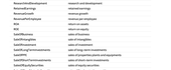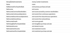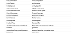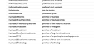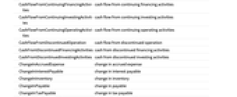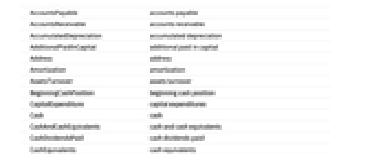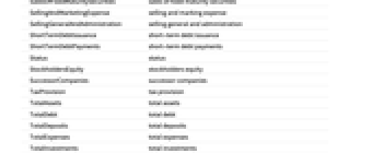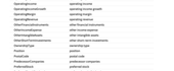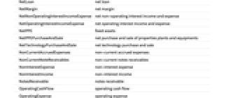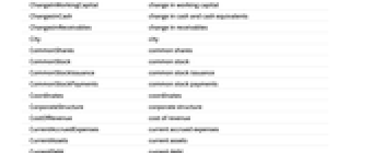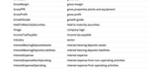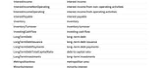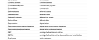 AccountsPayable accounts payable AccountsReceivable accounts receivable AccumulatedDepreciation accumulated depreciation AdditionalPaidInCapital additional paid in capital Address address Amortization amortization AssetsTurnover assets turnover BeginningCashPosition beginning cash position CapitalExpenditure capital expenditures Cash cash CashAndCashEquivalents cash and cash equivalents CashDividendsPaid cash dividends paid CashEquivalents cash equivalents CashFlowFromContinuingFinancingActivities cash flow from continuing financing activities CashFlowFromContinuingInvestingActivities cash flow from continuing investing activities CashFlowFromContinuingOperatingActivities cash flow from continuing operating activities CashFlowFromDiscontinuedOperation cash flow from discontinued operation CashFromDiscontinuedFinancingActivities cash from discontinued financing activities CashFromDiscontinuedInvestingActivities cash from discontinued investing activities ChangeInAccruedExpense change in accrued expense ChangeInInterestPayable change in interest payable ChangeInInventory change in inventory ChangeInPayable change in payable ChangeInTaxPayable change in tax payable ChangeInWorkingCapital change in working capital ChangesInCash change in cash and cash equivalents ChangesInReceivables change in receivables City city CommonShares common shares CommonStock common stock CommonStockIssuance common stock issuance CommonStockPayments common stock payments Coordinates coordinates CorporateStructure corporate structure CostOfRevenue cost of revenue CurrentAccruedExpenses current accrued expenses CurrentAssets current assets CurrentDebt current debt CurrentLiabilities current liabilities CurrentNotesPayable current notes payable CurrentRatio current ratio DeferredAssets deferred assets DeferredCosts deferred costs DeferredTaxAssets deferred tax assets DefunctDate defunct date Depreciation depreciation DepreciationAmortizationDepletion depreciation amortization depletion DepreciationAndAmortization depreciation and amortization EBIT earnings before interest and tax EBITDA earnings before interest tax depreciation and amortization Employees total employees EndCashPosition end cash position EntityClasses entity classes EntityTypeList entity type list EquityInvestments equity investments FinancialHealthGrade financial health grade FinancialLeverage financial leverage FinancingCashFlow financing cash flow FormerNames former names FoundingDate founding date FreeCashFlow free cash flow GeneralAndAdministrativeExpense general and administrative expense Goodwill goodwill GoodwillAndOtherIntangibleAssets goodwill and other intangible assets GrossLoan gross loan GrossMargin gross margin GrossPPE gross properties plants and equipment GrossProfit gross profit GrowthGrade growth grade HeldToMaturitySecurities held to maturity securities Image company logo IncomeTaxPayable income tax payable Industry sector InterestBearingDepositsAssets interest bearing deposits assets InterestBearingDepositsLiabilities interest bearing deposits liabilities InterestExpense interest expense InterestExpenseNonOperating interest expense from non-operating activities InterestExpenseOperating interest expense from operating activities InterestIncome interest income InterestIncomeNonOperating interest income from non-operating activities InterestIncomeOperating interest income from operating activities InterestPayable interest payable Inventory inventory InventoryTurnover inventory turnover InvestingCashFlow investing cash flow LongTermDebt long-term debt LongTermDebtIssuance long-term debt issuance LongTermDebtPayments long-term debt payments LongTermDebtTotalCapitalRatio debt to capital ratio LongTermInvestments long-term investments MetropolitanArea metropolitan area MinorityInterest minority interest MoneyMarketInvestments money market investments Name name NetBusinessPurchaseAndSale net business purchase and sale NetIncome net income NetIncomeCommonStockholders net income earned by common stockholders NetIncomeContinuousOperations net income from continuous operations NetIncomeDiscontinuousOperations net income from discontinuous operations NetIncomeExtraordinary net income from extraordinary NetIncomeGrowth net income growth NetIntangiblesPurchaseAndSale net intangibles purchase and sale NetInterestIncome net interest income NetInvestmentIncome net investment income NetInvestmentPurchaseAndSale net investment purchase and sale NetLoan net loan NetMargin net margin NetNonOperatingInterestIncomeExpense net non-operating interest income and expense NetOperatingInterestIncomeExpense net operating interest income and expense NetPPE fixed assets NetPPEPurchaseAndSale net purchase and sale of properties plants and equipments NetTechnologyPurchaseAndSale net technology purchase and sale NonCurrentAccruedExpenses non-current accrued expenses NonCurrentNoteReceivables non-current notes receivables NonInterestExpense non-interest expense NonInterestIncome non-interest income NotesReceivable notes receivable OperatingCashFlow operating cash flow OperatingExpense operating expense OperatingIncome operating income OperatingIncomeGrowth operating income growth OperatingMargin operating margin OperatingRevenue operating revenue OtherFinancialInstruments other financial instruments OtherIncomeExpense other income expense OtherIntangibleAssets other intangible assets OtherShortTermInvestments other short-term investments OwnershipType ownership type Position position PostalCode postal code PredecessorCompanies predecessor companies PreferredStock preferred stock PreferredStockDividends preferred stock dividends PreferredStockIssuance preferred stock issuance PreferredStockPayments preferred stock payments PretaxIncome pre-tax income ProfitabilityGrade profitability grade PurchaseOfBusiness purchase of business PurchaseOfEquitySecurities purchase of equity securities PurchaseOfFixedMaturitySecurities purchase of fixed maturity securities PurchaseOfInt