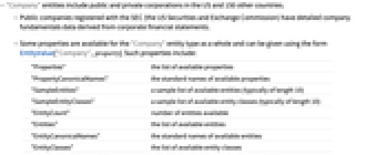 - Some properties are available for the "Company" entity type as a whole and can be given using the form EntityValue["Company",property]. Such properties include: