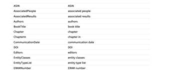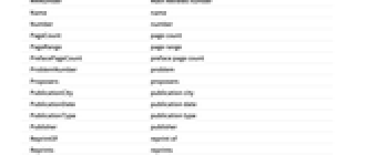 ASIN ASIN AssociatedPeople associated people AssociatedResults associated results Authors authors BookTitle book title Chapter chapter ChapterIn chapter in CommunicationDate communication date DOI DOI Editors editors EntityClasses entity classes EntityTypeList entity type list ERAMNumber ERAM number Errata errata ErratumTo erratum to EuDMLNumber EuDML number FormattedReference reference ISBN10 ISBN‐10 ISBN13 ISBN‐13 Issue issue Item item JFMNumber JFM number Journal journal JSTORNumber JSTOR number Language language Links links MRNumber Math Reviews number Name name Number number PageCount page count PageRange page range PrefacePageCount preface page count ProblemNumber problem Proposers proposers PublicationCity publication city PublicationDate publication date PublicationType publication type Publisher publisher ReprintOf reprint of Reprints reprints Solvers solvers Status status ThesisType thesis type Title title TranslationOf translation of Translations translations Translators translators URL URL Volume volume VolumeCount volume count ZblNumber Zentralblatt number