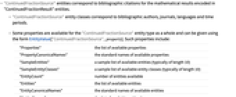 - Some properties are available for the "ContinuedFractionSource" entity type as a whole and can be given using the form EntityValue["ContinuedFractionSource",property]. Such properties include: