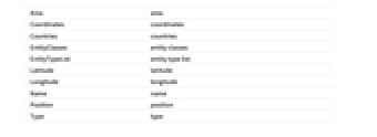 Area area Coordinates coordinates Countries countries EntityClasses entity classes EntityTypeList entity type list Latitude latitude Longitude longitude Name name Position position Type type