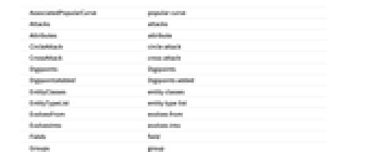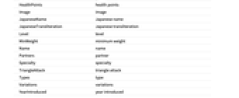 AssociatedPopularCurve popular curve Attacks attacks Attributes attribute CircleAttack circle attack CrossAttack cross attack Digipoints Digipoints DigipointsAdded Digipoints added EntityClasses entity classes EntityTypeList entity type list EvolvesFrom evolves from EvolvesInto evolves into Fields field Groups group HealthPoints health points Image image JapaneseName Japanese name JapaneseTransliteration Japanese transliteration Level level MinWeight minimum weight Name name Partners partner Specialty specialty TriangleAttack triangle attack Types type Variations variations YearIntroduced year introduced