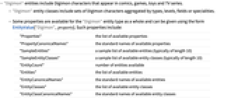 - "Digimon" entity classes include sets of Digimon characters aggregated by types, levels, fields or specialities.
