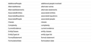- "FamousMathProblem" entity classes include classifications based on type of result (e.g. "Law", "Lemma", "Axiom", "Conjecture") and association with a particular person (e.g. "Hilbert23", "Smale").